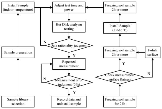 In the test, the Kapton probe was fixed on the stainless steel sample holder, and two sample columns were placed on both sides of the probe (Figure 3c). To ensure the probe was in close contact with the sample, two plastic film-covered specimens were compacted with a sample holder’s clamp. As the measurement of unfrozen soil thermal conductivity finished, the specimens were placed in a freezing cabinet (Figure 3d) and frozen for 24 h (T < −10 °C). Then the specimens were placed into the stainless steel sample holder and continued to freeze in the cabinet for 2 h again (to avoid the environment thermal disturbance). The thermal conductivity analyzer needs to define appropriate test time and power parameters to obtain reasonable test results. For every specimen, the thermal conductivity measurement was conducted twice and took the average of the two test results as the experimental result. When the measuring error was larger than 5% due to improper parameter settings, multiple experiments were conducted to obtain reasonable test results. The main test procedures are listed in Figure 4. In addition, the flatness of the pre-frozen soil sample measuring surface was necessarily checked before the testing of frozen soil. The roughness surface needed to be polished by scraper and placed in the cabinet until the temperature fluctuation was eliminated.