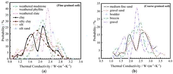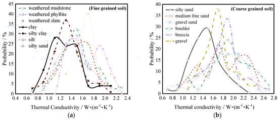 Probability distribution of thermal conductivity of 12 types of unfrozen soil. (a) Fine grained soil, (b) Coarse grained soil.