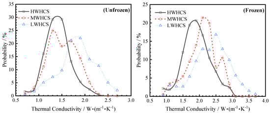 The average value and probability distribution of thermal conductivity of three soil clusters is shown in Table 3 and Figure 7. It can be seen that the roughly thermal conductivity magnitude order is LWHCS, MWHCS and HWHCS. The average thermal conductivity of unfrozen clusters () is 1.822, 1.556 and 1.418 . Among the main probability range (20%~80%), the thermal conductivity value of each unfrozen cluster varies between 1.518~2.171, 1.311~1.816, 1.193~1.605 . Whereas the corresponding average values are 2.258, 1.999 and 1.822 , and the high-probability range is 1.811~2.709, 1.611~2.334 and 1.493~2.154 for the frozen clusters (), respectively (see Table S2 in Supplementary Materials). This is because thermal conductivity of soil’s mineral skeleton and the particle size of LWHCS are relatively larger than those of MWHCS and HWHCS. Meanwhile, based on the average dry density and water content data in Table 3, it can be inferred theoretically that the average density (,) of LWHCS is still large one under natural condition. So the test results show that the average values and main probability range of thermal conductivity of LWHCS is generally larger than those of MWHCS and HWHCS.