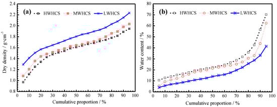 (a) Dry density and (b) water content cumulative proportion of three soil clusters.