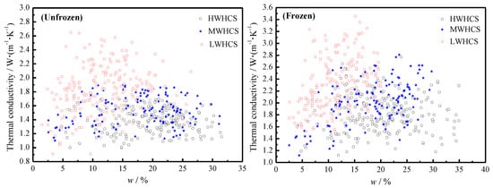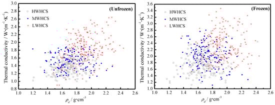 Preliminary research results show that both dry density and water content are significant influencing factors of soil’s thermal conductivity [7,8]. Generally, it is considered that dry density and water content have positive correlation with soil thermal conductivity. However, the test results of thermal conductivity of three soil clusters show that this conclusion is sometimes invalid. Thermal conductivity distribution of different dry densities and water content are shown in Figure 9 and Figure 10. It shows that the thermal conductivities of three soil clusters discretely distributes at different dry density and water content intervals. In most cases, the thermal conductivity has no obvious correlations with dry density or water content. This is because the combination of soil dry density and water content parameters is diverse under natural environmental conditions, and as a complex multiphase mixture, soil thermal conductivity is influenced by many other factors. Meanwhile, it should be noted that the thermal conductivity shows an approximate increasing trend for certain cases, such as unfrozen LWHCS with increasing dry density, and frozen LWHCS and MWHCS with increasing water content.