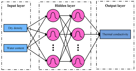 The radial basis function (RBF) neural network has the characteristics of simple structure, fast learning speed and good convergence, and is widely used in the field of nonlinear function approximation [46,47]. Thus, this method has been applied for three clusters’ thermal conductivity prediction. The dry density and water content is respectively used as the input layer of the RBF neural network, and the thermal conductivity is used as the output layer. The settings of the neural network structure in JMP Pro 13.0 software mainly include the activation function, the number of hidden layers, and the number of nodes in each layer. Considering the calculation accuracy and amount, the radial Gaussian function is selected as the activation function, the number of hidden layers is set as 2, and the number of nodes in each layer is 10. The established relationship diagram of the RBF neural network is shown in Figure 11.