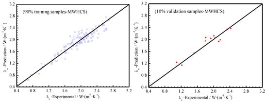 Besides, all of thermal conductivity measurement results of three soil clusters are randomly divided into 9:1 ratio; 90% of the sample data were used for training samples of the neural network model, and the remaining 10% were used as the validation of RBF neural network predictive model. Additionally, based on the feedback of training results, small samples with larger deviations are eliminated in the calculation to improve the prediction accuracy. Figure 12 is the predictive values of unfrozen MWHCS. It can be seen that the predicted results of RBF neural network method are in good agreement with the experimental results (R2 = 0.82).
