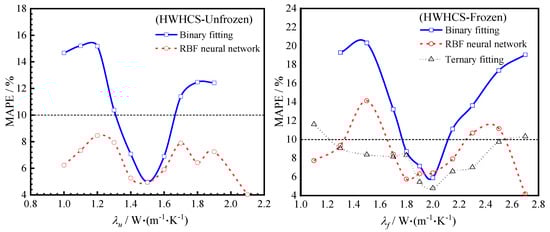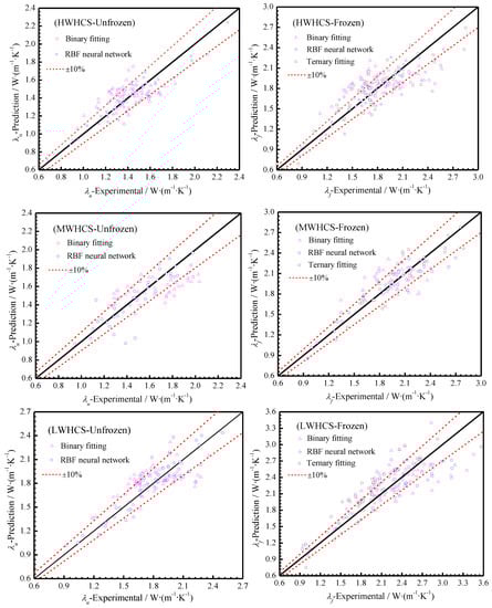 The R2 and quantitative proportion of relative error within ±10% () for three prediction models is shown in Table 6 and Table 7. It can be seen that the fitting degree of the RBF neural network method and the ternary fitting method is much higher than that of the binary fitting method. The maximum R2 and of the ternary fitting method reaches up to 0.88 and 74.5%, while binary fitting method is only 0.561 and 39.6%. Besides, the abnormal sample rejection ratio of three predictive models is 10%~15%, 10% and 2%~3%, respectively. This demonstrates that the ternary fitting is the most accurate thermal conductivity prediction method. However, the ternary fitting method has some methodological limitations: (1) the fitting formulas are based on a large amount of test data, which cannot completely avoid high costs and a lengthy thermal conductivity experiment; (2) it can only be used to predict thermal conductivity of frozen soils, which limits its application scope. The RBF neural network method, meanwhile, has comparative R2 and as well as the ternary fitting method, and it can also be used for unfrozen soils. It also can be noted that the R2 and of MWHCS is usually lower than that of HWHCS and LWHCS with binary or ternary fitting models, while the prediction results of the RBF neural network method for MWHCS is more accurate. Therefore, it can be concluded that the RBF neural network method can better identify soil’s complex composition characteristics and be the optimal thermal conductivity prediction method.