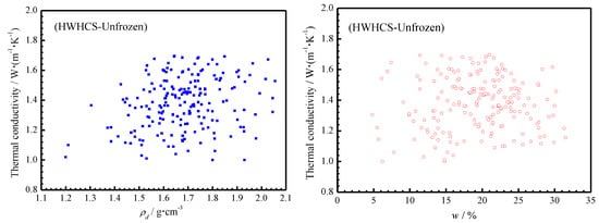 As everyone knows, soil is a complex multiphase mixture and its thermal conductivity is influenced by many factors [7,8]. Among various impact parameters, dry density and water content are the most important and analyzed factors. A generally accepted concept is that soil thermal conductivity increases as the dry density or water content increase. However, as shown in Figure 15, dry density as well as water content do not have strong positive correlations with soil thermal conductivity under specific natural conditions. The thermal conductivity of HWHCS distributes randomly and sparsely under different dry density and water content, and it seems hard to find a suitable function describing this phenomenon. Thus, the binary fitting formula can only take the form of a piecewise function to promote prediction accuracy. However, the R2 of fitting formulas are still very low (0.561 for unfrozen HWHCS). Herein, it can be concluded that the formula fitting method based on incomplete parameters may not be effective for soil thermal conductivity prediction, especially with multiple soil types and complex compositions.