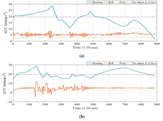 Figure 18a–d illustrate the variations in AUV attitude during object-tracking tests performed by towing the tank carriage to change the speed of the target. One experiment with target speeds of 0.1 and 0.3 m/s and two experiments with a target speed of 0.5 m/s were conducted. The figure plots the relationship of changes in the heading angle with roll and pitch values when the AUV tracks the target. Large variations in heading angle easily change the roll value, whereas the attitude of the pitch is less affected.