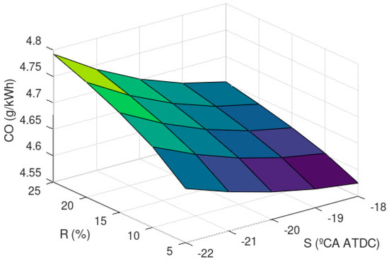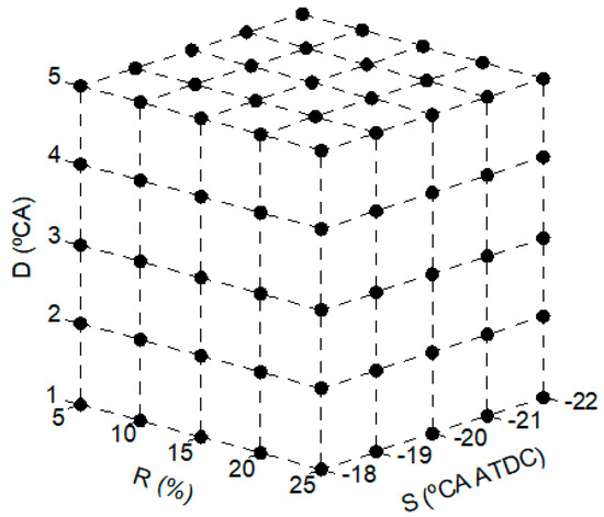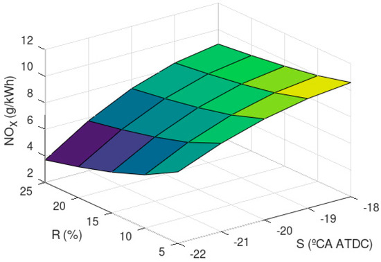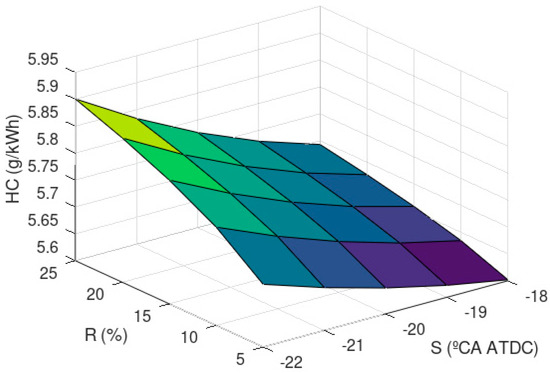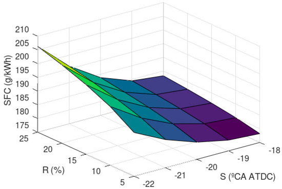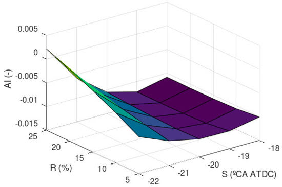 | Case | S (°CA ATDC) | R (%) | D (°CA) | SFC (−) | NOx (−) | CO (−) | HC (−) | AI (−) |