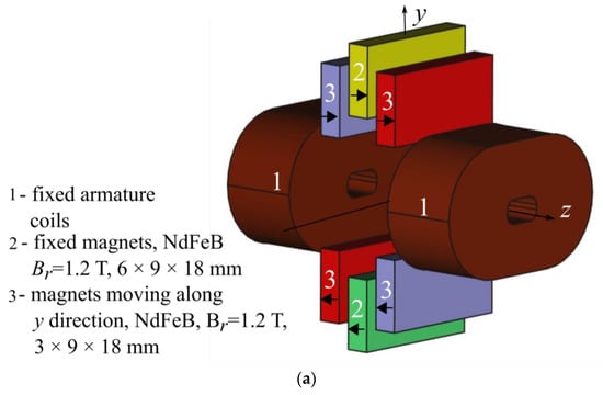 In the design of electromagnetic vibration energy harvesters, the electromagnetic part is modelled using either numerical or analytical models [8,17,18,19]. In this work, the model segment of the routine involves determination of useful electromagnetic quantities by combining a 3D integral method, analytical formulas with a steady-state circuit simulation considering the electronic converter. For the purposes of the optimization process, it is not necessary to consider the whole system and its complicated kinematics resulting from the connection of the generator parts with elements of mechanical support [20]. As a consequence, the motional effects are modelled as simply as possible, assuming that the displacement of the moving element of the converter is sinusoidal in time, which means that the system operates at a prescribed frequency and magnitude.