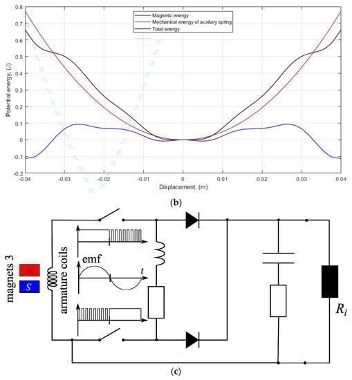 The CAD diagram of the considered microgenerator, variations of potential energy, and electronic converter are depicted in Figure 1a–c.