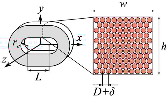 Racetrack coil with dimensions: rc—inner radius; L—active length; D wire diameter; δ—air-gap between wires; w, h—assumed width and height of coil walls, respectively.