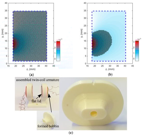 Results of optimization: distribution of turns over coil cross-section plane (see Figure 2) before (a) and after optimization (b). Dashed line denotes assumed area w× h with rc = 2 mm, and w, h and δ equal to 22, 33 and 0.01 mm, respectively. Colormap displays distribution of quantity (2) in V∙s/m. c) Assembled armature using a 3d-printed coil carcass including formed bobbin and flat lid so as to obtain the distribution of turns shown in Figure 4b. The coils in the physical system are connected in parallel.