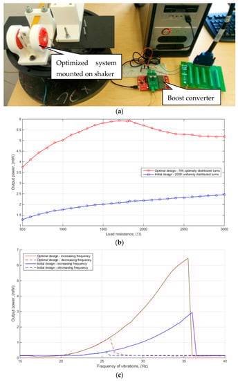 Figure 5c presents the measured characteristics of output power vs. frequency for the initial and optimal designs. The maximum power is reached at 35.5 Hz and is equal to 6.46 mW. Due to nonlinear magnetic force caused by interaction between moving magnets (magnets 3 in Figure 1a) and stationary magnets (magnets 2 in Figure 1a), the proposed energy harvester operates in the wide range of vibration frequency (around 10 Hz) providing output power sufficient to charge small Li-Ion battery in a power supply of a wireless sensor network. In comparison to reference systems of similar size operating at the same value of acceleration our converter has very similar range of operation frequency (7.8 Hz in [31] and 10 Hz in [32]), although it provides significantly higher output power (1.18 mW in [31] and 2.5 mW in [32]). The latter confirms the applicability and novelty of the proposed method for maximization of the output power of such systems.