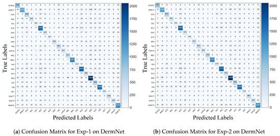 Figure 1 shows that many reciprocatory misclassifications in Exp-1, like between Eczema (Abbreviated as ECZ in Figure 1) and Psoriasis Lichen Planus (PSO) and between Actinic Keratosis BCC (AKBCC) and Seborrheic Keratosis (SEB), are corrected to a large extent in Exp-2 by utilizing taxonomical relationship among diseases.