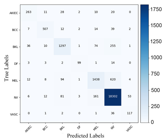 Confusion Matrix showing number of correctly classified and misclassified images per class in ISIC Archive-2018.
