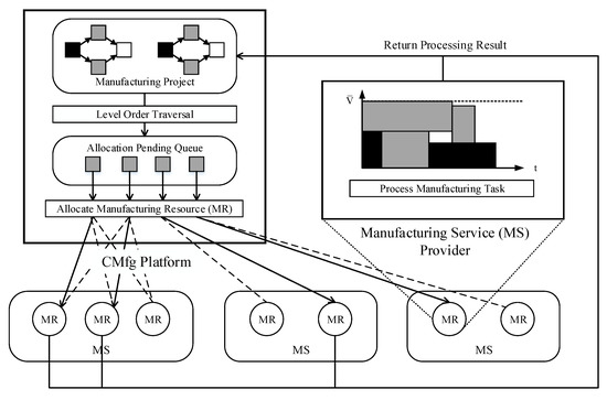 The main components of the CMfg environment are MT and MR. Due to the consideration of management granularity, these two components are not directly presented to the scheduling problem.
