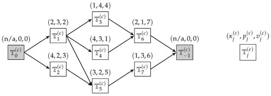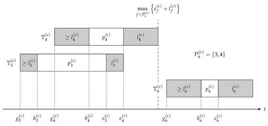 Figure 5 depicts the precedence constraints in MP that contain Equations (15) and (16), which, respectively, mean the ready time of any MT is no earlier than the complete time of its predecessors and the start time of any MT is no earlier than its ready time plus its logistics duration.