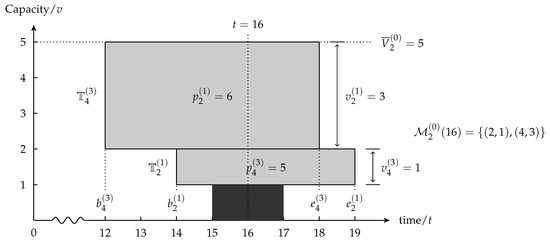 During the processing of MT, Equation (13) means the available capacity of MR needs to be no less than the capacity required by the MT, and Equation (14) indicates the sum of occupied capacity by active MTs does not exceed the maximum resource capacity at time