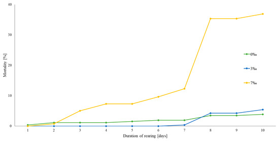 Mortality is a common problem in fish fry farms due to diseases mainly caused by pathogens [49]. Salt used in farming freshwater fish which tolerate some salinity is quite effective, cheaper, and much healthier (for fish and consumers). Sometimes, in aquaculture, fish are bathed prophylactically in brine to avoid pathogen development [50]. Our results showed that salinity had a statistically significant effect on cumulative mortality in fish. The greatest mortality was observed in the 7‰ salinity tank, increasing drastically on day 8 of the experiment to about 37% (Figure 1). Here, the length of the fish was the greatest. It seems that larger pike fry cannot acclimate to these long-term osmotic conditions. This is in good agreement with other studies on pike, where the mortality of larger fish was greater than that of smaller fish [18]. The cumulative mortality of fish from tanks with a 3‰ salinity was surprisingly similar to that of the control group. What is more, the BCI was greater than in the control group. These findings suggest that this level of salinity is well-tolerated by pike, which is consistent with reports of this species in coastal areas all around the Baltic Sea, where salinities vary from 4‰ to 7‰ [18]. The fact that around 97% of fish survived this salinity treatment and had a condition factor similar to that of the controls indicates that the fish in 3‰ salinity did not experience a loss of water due to salinity stress. A loss of water is believed to be one of the reasons why fish have died in salinity treatments [18].