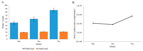 (A) Average weight and length of fish at the end of the experiment (n = 20/group) and (B) the effects of salinity on the pike condition index = weight (g)/fork length (mm)3; the mean ± SEM for each salinity level (n = 20).