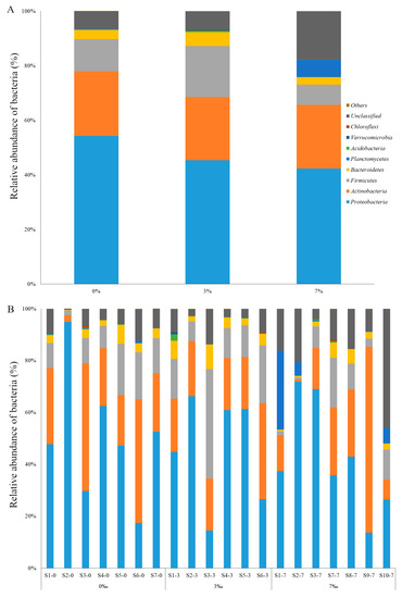 To verify the quality and bacterial origin of DNA, PCR was performed with two universal 16S rRNA primers: 8F and 534R [37]. Based on these results, the DNA yield, and quality, 20 samples were chosen (seven from both TS_0‰ and TS_7‰, and six from TS_3‰) and sent to Genomed S.A (Poland) for the mass sequencing of 16S rRNA amplicons. To prepare the 16S rRNA gene amplicons, the Illumina protocol “16S Metagenomic Sequencing Library Preparation” was used. In the PCR reaction, the variable V3 and V4 regions of the 16S rRNA gene were amplified using the following primers: forward (5′ CCTACGGGNGGCWGCAG 3′) and reverse (5′ GACTACHVGGTATCTAATCC 3′) [38]. The reaction was performed according to the Illumina protocol. To index the amplicons, a Nextera®XTIndex Kit (Illumina, San Diego, CA, USA) was used according to the producer’s instructions. For DNA sequencing, an Illumina MiSeq instrument was used, employing a 2 × 250 paired-end protocol, along with a Miseq reagent kit v3 (Illumina, USA).