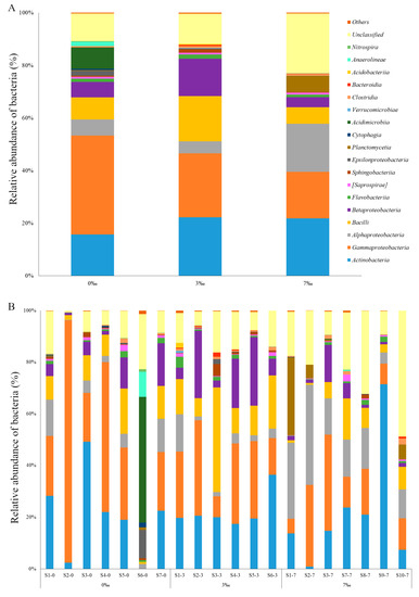 Relative abundance (%) of the most prevalent bacterial classes in three groups kept at different levels of salinity (A) and in individual pike (B). Figures show all classes with an abundance >0.5%. Classes with an abundance ≤0.5% are pooled and labeled as “Others”.