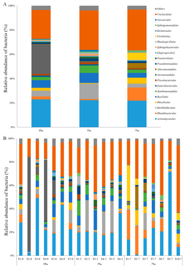 Relative abundance (%) of the most prevalent bacterial orders in three groups kept at different levels of salinity (A) and in individual pike (B). Figures show all orders with an abundance >2.5%. Orders with an abundance ≤2.5% are pooled and labeled as “Others”.