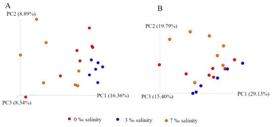 Beta diversity metrics. Principal coordinates analysis (PCoA) of unweighted (A) and weighted (B) Unifrac distances of gut microbial communities associated with different salinity levels. The figures show plots of individual fish according to their microbial profile.