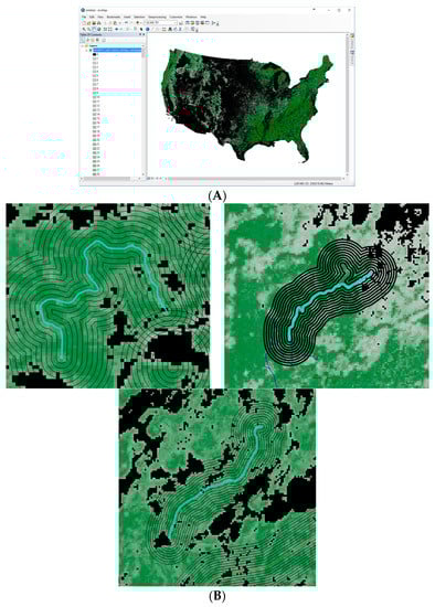 Figure 1B). Around each trail a series of rings was created. Each ring represents an additional growing distance of 45 m from the center of the trail. The average canopy coverage at a fixed time was analyzed for each ring.
