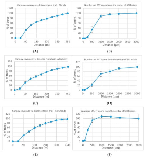 Figures S1 and S2). The canopy coverage was evaluated at an additional growing distance of 45 m surrounding the trail. The mean value ± standard error of the mean (s.e.m.) is displayed. The results show dieback away from the trail center which continues to a distance of 450 m.