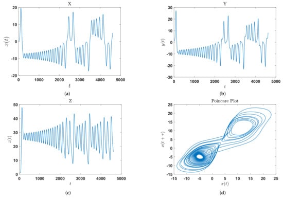 Bi-dimensional representation of Lorenz model. (a) Time evolution of . (b) Time evolution of . (c) Time evolution of . (d) Poincaré plot for . The lag used for the Poincaré plot is .