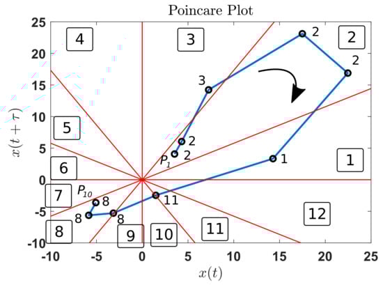 This paper uses the SD feature extraction algorithm in [], which is summarized in the following steps: (1) The Poincaré plot is traced using a lag of 15, (2) The phase-space represented by the Poincaré plot is subdivided into several angular regions as shown in Figure 14, (3) Each region is assigned to a symbol represented by an integer number, 24 angular regions are considered in this application, (4) The symbolic representation of the vibration signal is processed for obtaining the histogram. This is simply attained by counting the number of points in each angular region.