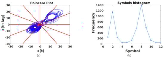 In this research, rather than partitioning the n-dimensional space, we propose the partition of the 2D surface representing the interception of the current phase space with a plane. A 2D representation of the Lorenz model is shown in Figure 4. The dynamics of this model is represented in terms of their components , and and their representation in can be approximated by using the Poincaré plot as shown in Figure 4. Such a plot is constructed by using only the component ; however, it can recover important features of the underlying dynamical system. In practical applications, such as fault detection in rotating machinery using vibration signals, the current underlying dynamical system is generally unknown and in the best of cases only approximate models are provided. The only known information is the time series representing the vibration signal, in consequence, we are constrained to attain a useful system representation using this information. When dealing with a dynamical system as previously described, the surface of the phase space can be partitioned into r disjoint subsets denoted . Each subset is represented by a symbol . An orbit in the phase space is represented by a sequence of visited symbols []. The surface can be arbitrarily subdivided into several cells, and the points of the Poincaré plot located in each cell can be represented by the same symbol. Alternatives of feasible partitions are Voronoid tessellations [], or fractal based tessellations []. The sequence of generated symbols can be used for constructing state machines using sliding block codes [] where a window of length is shifted to the right one symbol at a time for constructing a -Markov machine useful for anomaly detection []. In a previous research concerning faults classification in gearboxes, the Poincaré plot has been subdivided in a set of angular regions and each region has been represented by a symbol. An illustration of this concept is presented in Figure 5. A fragment of a trajectory in the Poincaré plot is shown and each point in the trajectory is assigned to a symbol according to the location of each point. Each angular region corresponds to one symbol and the partition of the phase space includes 12 symbols: . In this example, the trajectory is represented by the set of symbols . The count of points corresponding to each symbol provides a set of features that can enable fault classification. This is illustrated in Figure 6 where the Poincaré plot constructed with component for the Lorenz model is shown along the angular partition of . The histogram of symbols calculated for this partition is shown in Figure 6b.