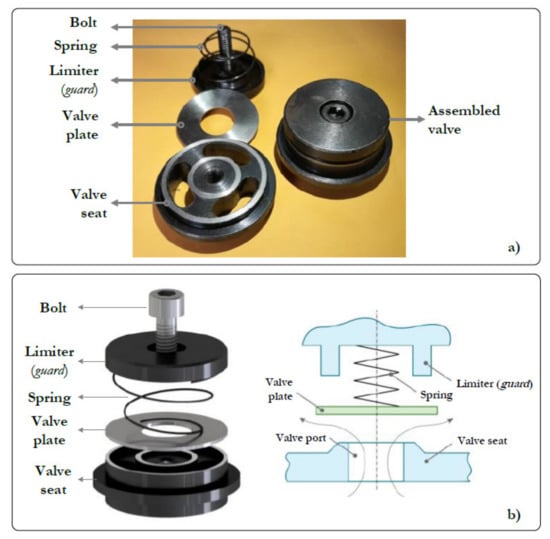 Concerning the valves, four types of faults were included: (1) valve seat wear, (2) corrosion of the valve plate, (3) fracture of the valve plate and (4) broken spring. The different conditions of the valves are shown in Figure 11. The valve seat wear is attained by machining on the face of the valve seat and reducing its depth 1.44 mm. The corrosion of the valve plate is simulated by performing a through hole with a diameter of 2.5 mm. The fracture of the valve plate is performed by cutting the plate, the diameter of the thread is 1.6 mm. The break of the spring is obtained by cutting the spring with a thread of 1.6 mm of diameter.