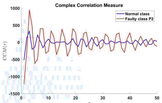 Calculation of the Complex Correlation Measure (CCM) does not require the explicit plotting of the Poincaré plot. The calculation is performed over the original time series of the vibration signal denoted as well as their delayed version . The i window includes the points denoted , and where . With this information, Equations (5) and (6) are evaluated. The CCM of the vibration signals was calculated for varying between 1 and 50. An example of this feature set is shown in Figure 17 for a signal extracted from the healthy class and for the faulty class . In general the amplitude of the CCM feature is higher for the faulty class when compared to the normal class.