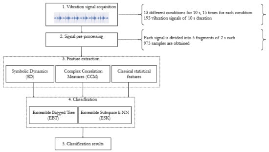 Figure 18 depicts the methodology for multi-fault classification. In the first stage, vibration signals of 13 conditions were acquired, and each condition is repeated 15 times, all the signals of 10 s length, i.e., 195 signals per class. In the pre-processing stage, each signal is subdivided into five fragments of 2 s, obtaining 975 samples for the 13 conditions. In the third stage of feature extraction, for each of fragments three different sets of features are extracted: (a) the statistical features set is composed of 12 features, (b) the SD is represented by a set of 24 features, and (c) the CCM features are composed of 50 features. For the classification stage, each feature dataset is split into a test set (16%) and a training set (84%). Two types of classifiers are trained and 10-fold cross-validated: The Ensemble Bagged Tree (EBT) [] and the Ensemble Subspace k-NN (ESK) []. The classification accuracy of each trained classifier is evaluated over the test dataset. This procedure is repeated for each of the vibration signals collected from the accelerometers A1, A2 and A3, and the results are compared.