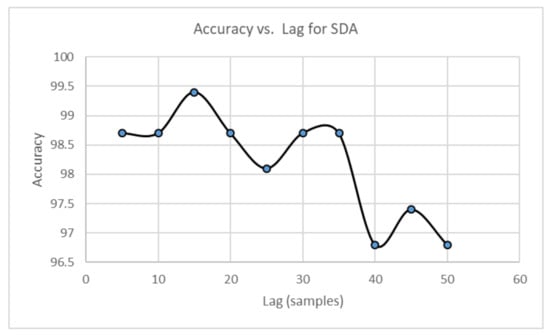Parameters for feature calculation are set in a heuristic manner. The first parameter corresponds to that is used for calculation of CCM features. The CCM features are calculated by varying between 1 and 60 for the vibration signal A1. The fault classification is performed by using the EBT algorithm, and the accuracy is plotted as a function of . The results are shown in Figure 19. The accuracy increases as increases, and it settles at . In consequence, we can set for the rest of experiments. Similarly, calculation of SD features requires previous construction of the lagged Poincaré plot according to the lag . In this case, is varied between 5 and 60. For each lag value, the SD features are calculated from signal A1, and the fault classification model uses the EBT algorithm. The accuracy is plotted with respect to the lag value, and the lag value corresponds to the maximal accuracy obtained in classification. The plot is shown in Figure 20.