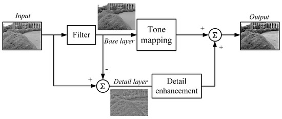 Figure 1. The detail layer is processed separately for preserving and enhancing, whereas the base layer is tone-compressed through the tone mapping. After separated processing, the base layer is recomposed with the detail layer.