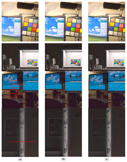 Figure 6. In order to compare the detail results, the edge renderings and noise differences in the detail area of the RGB channels were compared in