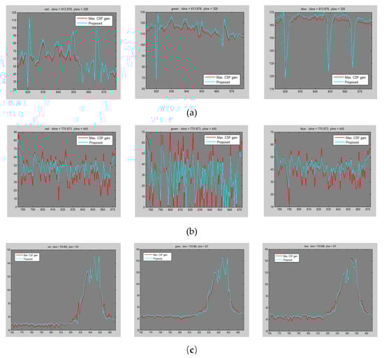 Figure 6c. It is easily confirmed that the proposed model is more sensitive than those of different methods around the edge and the object boundary. The detail enhancement is well-compared in color patches and in the background graph in first row images of