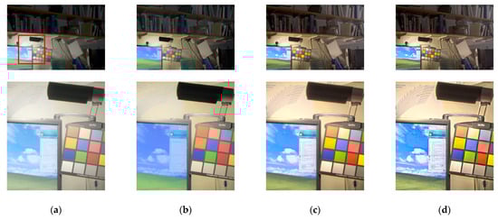 Figure 9, existing methods show lower contrast around the Macbeth color checker and lower detail of the drawing behind the monitor. On the other hand, the proposed method shows that the contrast and the detail of the drawing behind the monitor are clearly more enhanced than in other methods. In