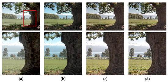 Figure 11 shows an outdoor scene with strong lightness and contrast. In the proposed method, the overall brightness is evenly improved and the detail of the wood is well represented. The area included in the background is clearly visible due to the improved contrast.