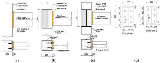 Details of joint specimens (unit: mm). (a) Specimens ST-1 and ST-2; (b) specimens ST-3 and ST-4; (c) specimen ST-6; (d) end-plate.