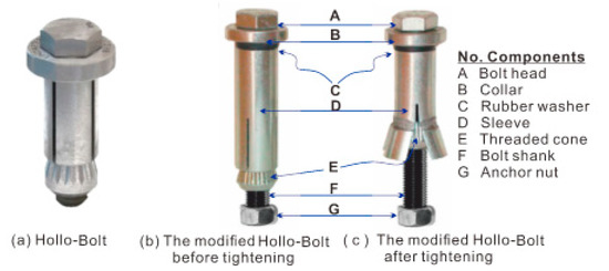 Some work has focused on modifying the blind bolt to reduce the likelihood of local bucking of the steel tube by setting a device anchorage for the blind bolt to improve the anchorage characteristics of the fastener. First, Gardner and Goldsworthy [7] proposed to weld a piece of straight or hooked reinforcing bar to the end of the bolt shank for the blind bolt. Then, they focused on modifying an Ajax Oneside to investigate the tensile behavior of blind bolted T-stub connections to circular CFST columns with a straight or hooked reinforcing bar welded to the blind bolts [8,9]. The test results showed that the anchorage provided by the extensions can limit the localized bulging of the tube face and dramatically improve the strength and stiffness of the connections in tension. However, weld fractures easily occurred between the reinforcing bars and the bolt ends would easily form if precautions were not taken, and short extensions would result in anchorage failure. Furthermore, the final direction of the hooked reinforcing bars after tightening could not be guaranteed to be consistent. Wang et al. [10,11,12,13] investigated the behavior of blind bolted end-plate (flush and extended) connections to square and circular CFST columns; in this work, 50-mm-long straight extensions were used for the blind bolts, and similar conclusions were drawn. Then, Tizani and Dan [14] proposed the Extended Hollo-Bolt (EHB), which extended the bolt shank of the Hollo-Bolt and attached an anchor nut at the end. Pitrakkos et al. [15] conducted a comprehensive experiment on a novel anchored blind bolt in tension, indicating that the anchored blind bolt can finally achieve the ultimate strength of its internal bolt to enhance the tensile strength and stiffness of the blind bolt. This research was continued by Tizani et al. [16,17], who carried out a series of monotonic and cyclic loading tests on blind bolted end-plate connections to CFST columns using EHBs, which exhibited a high ductility and energy dissipation capacity suitable for use in seismic design. These conclusions were further confirmed by the research reported by Agheshlui et al. [18], who studied the tensile performance of the modified Ajax Oneside with an anchor nut at the end.
