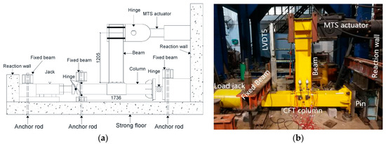 Strain gauges were placed at different positions for measuring the strains in the end-plate, steel tube and steel beam. All the readings were recorded by a DH-3816N static strain test and analysis system. The load applied to the beam end was recorded by the MTS loading system. The arrangement of the displacement transducers (LVDTs) used in the test is presented in Figure 5. LVDT1 and LVDT2 were adopted for monitoring the rotation of the column (θc). LVDT3 and LVDT4 were adopted for monitoring the rotation of the beam (θb), which were 30 mm away from column flange in the specimens with a strong beam and 180 mm away from column flange in the specimen with a weak beam, considering local beam buckling. LVDT5 was adopted for monitoring the displacement of the loading point at the beam end. The relative rotation between the column flange and beam can be derived from Equations (1)–(3).