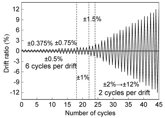 The experiment setup was illustrated in Figure 3. The CFST column was horizontally connected to the reaction wall through two hinge supports. For simulating seismic loading, one MTS hydraulic actuator with a 500 KN capacity was adopted to apply the cyclic load to the beam end. For reflecting the axial pressure of the CFST column in actual engineering, the axial load was applied at the top of the column by a hydraulic jack. The axial load level (n) is 0.3 for the CFST column, which is defined as n = N/Nu, where N is the axial load applied to the column and Nu is the nominal ultimate axial compressive load of the CFST column predicted by the specification [19]. The distance from the loading point on the beam to the column flange was 1.2 m. The cyclic load is controlled through the layer angular displacement, which is the ratio of the horizontal displacement of the beam end to the loading point distance, which was 1.2 m, as mentioned above. The loading procedure suggested by the SAC Joint Venture (1997) [20] for cyclic testing was adopted and is summarized in Figure 4.