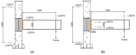 Arrangement of LVDTs (unit: mm). (a) For specimens ST-1–ST-5; (b) for specimen ST-6.