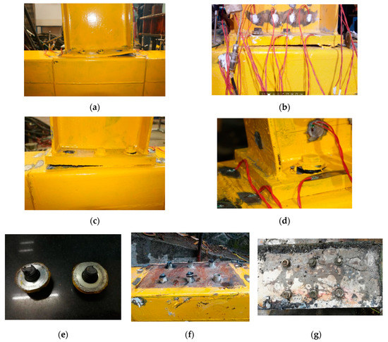 Failure mode II (specimens ST-3, ST-4, and ST-6). (a) ST-3; (b) ST-4; (c) ST-6; (d) steel beam in specimen ST-6; (e) fractured blind bolts; (f) tube wall in specimen ST-3; (g) core concrete in specimen ST-3.