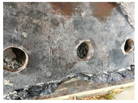 In the two failure modes, as shown in Figure 8, the anchored blind bolts embedded in the concrete basically remained intact, despite the different failure patterns exhibited by the blind bolts. However, scratches were clearly observed at the anchor nut, undoubtedly caused by the mechanical anchorage against the concrete. In addition, throughout the loading process, no welding fracture occurred in the fillet weld and plug weld between the steel tube and the C-shaped channel. According to the observations on the deformation conditions around the bolt holes, as shown in Figure 9, the square steel tube and the C-shaped channel fit closely together, indicating that the steel tube wall and the C-shaped channel can work well together. The observed results demonstrate that the two proposed methods can both be effective and provide stability to the performance of connections under cyclic loading.