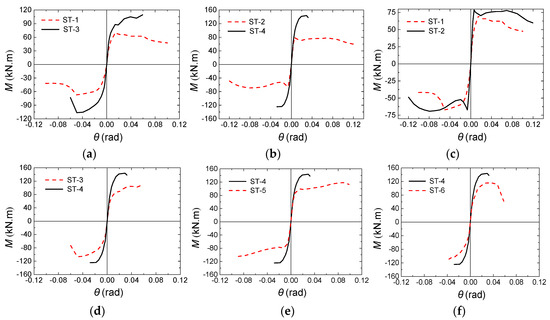 Figure 11a,b illustrate that the initial stiffness and flexural resistance of specimen ST-3 increased by 40% and 47%, respectively, compared to those of specimen ST-1 and that the initial stiffness and flexural resistance of specimen ST-4 increased by 22% and 84%, respectively, compared to those of specimen ST-2. The test results indicate that an increasing steel tube wall thickness had an improved effect on the stiffness and strength. As seen from parts (c) and (d) of Figure 11, the effect of end-plate thickness on the initial stiffness is similar to the effect observed due to the tube wall thickness, where the initial stiffness of specimens ST-2 and ST-4 increased by 42% and 26%, respectively, compared to those of specimens ST-1 and ST-3. However, in terms of the flexural resistance, when the connections failed in mode I, the influence of the end-plate thickness was negligible, as the flexural resistance was determined by the CFST columns; when the connections failed in mode II, a greater end-plate thickness increased the flexural resistance. Compared with specimen ST-1, the flexural capacity of specimen ST-2 increased by only 11%, while the flexural capacity of specimen ST-4 was 35% higher than that of specimen ST-3. Figure 11e shows that compared with those of specimen ST-5, the flexural resistance of specimen ST-4 increased by 22%, but the initial stiffness increased by only 7%. These results demonstrate that the use of the anchor nut in specimen T4 resulted in an increase in the flexural resistance as the failure mode changed from mode I to mode II but slightly increased the initial stiffness of connection. Figure 11f indicates that using a weak beam in specimen ST-6 resulted in a 19% reduction in the flexural resistance and an 8% reduction in the initial stiffness; however, significant improvement in the ductility of connection was observed.
