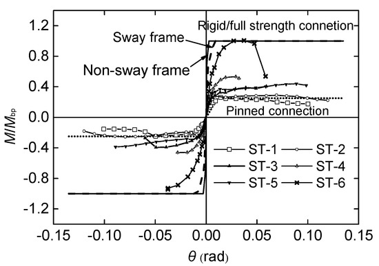 To determine the connection stiffness and strength in the moment–rotation envelope curve, the typed connection may be classified by EC3 [23]. A connection can be normally classified as nominally pinned, semi-rigid or rigid in terms of the connection stiffness. A connection is nominally pinned when the initial stiffness is less than 0.5EbIb/Lb, where Eb, Ib, and Lb are the elastic modulus, second moment of area, and span of the steel beam, respectively. A rigid connection has an initial stiffness greater than 25EIb/Lb for a non-braced frame and 8EbIb/Lb for a braced frame. A connection with an initial stiffness between these two thresholds is classified as semi-rigid. A connection can be classified as full strength, partial strength, and nominally pinned according to the connection strength. The maximum required connection resistance for nominally pinned connection design is 0.25Mbp, and the full-strength connection resistance is greater than Mbp, where Mbp represents the design plastic flexural resistance of the steel beam. If the flexural resistance is located between the two thresholds, the connection is partial strength. The classification of tested connections is illustrated in Figure 13. Most blind bolted flush end-plate connections to CFST columns are classified as semi-rigid and partial strength; however, specimen ST-6, with a weak beam, is classified as semi-rigid and full-strength.